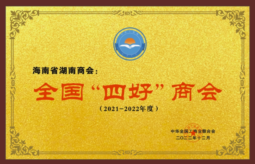 2023年2月荣获海南省工商联颁发的2021-2022年度海南省"四好"商会荣誉称号
