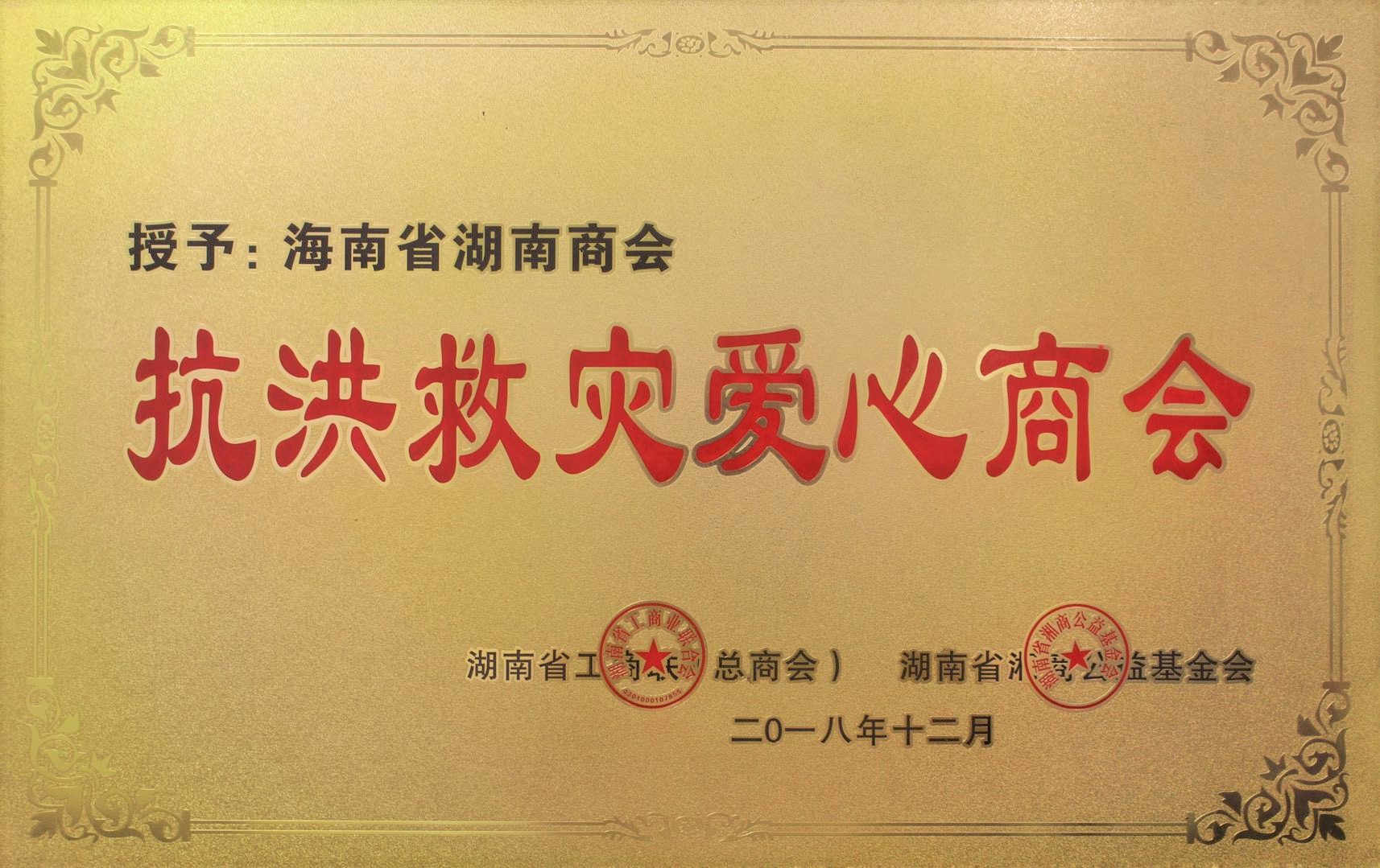 2018年12月荣获湖南省工商联颁发“抗洪救灾爱心商会”荣誉称号